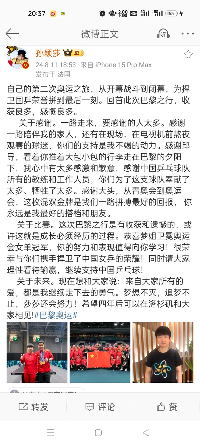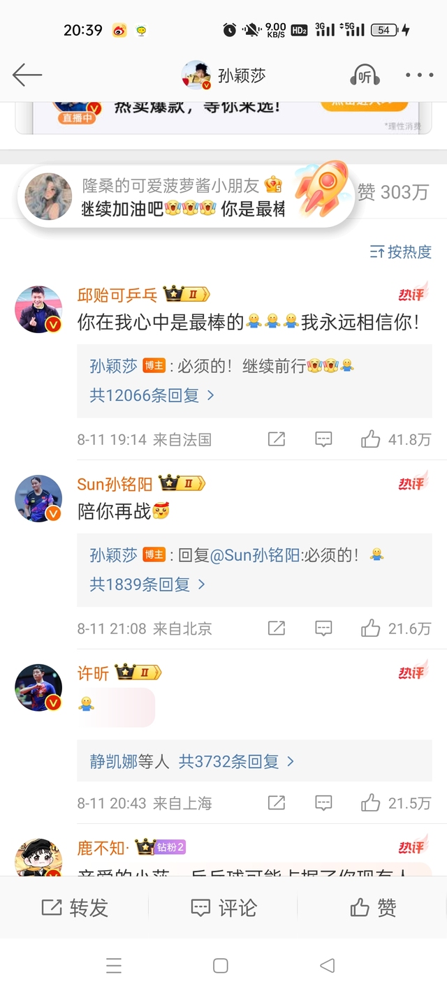 孙颖莎发了一条微博,虽然这个是公关写好的,她只是发一下就可以,但是邱贻可,孙铭阳等人给他在下面回复。一直对他有求必应的哥哥竟然没有回复。