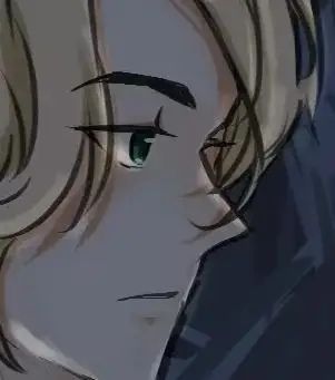 此外,他的头发被红日照得很耀眼,发色为白色偏黄,有着绿色的瞳孔