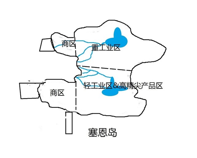 塞恩的后人创办了一家名为“交集产业”的公司,符号为“∩”。收购了几乎全岛的工厂为其工作。在靠南的两座半岛建立起商区。方便和玲珑岛商区进行贸易。作为主要收入来源。次要收入来源则是重工业区对材料进行加工。