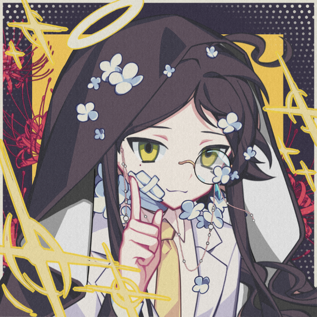 Notch身着一袭翩翩白衣,西装裁剪得体,宛如月光洒落的洁净。内里,一抹淡黄衬衫如初升的阳光,透出温暖的光泽。领带的色调略深,如同秋日黄昏,增添了几分沉稳。他的头上,一方斗篷轻轻覆落,如同夜幕中星辰点缀的天空,斗篷边缘隐约可见的白蓝花朵,仿佛在静谧中绽放。墨色的发丝间,花香缭绕,与颈间的花斗篷相映成趣。斗篷外层的黑,深邃如夜,内里的白,纯净如昼,而那半边金丝眼镜,则像是智慧的窗口,映射出不凡的光芒。