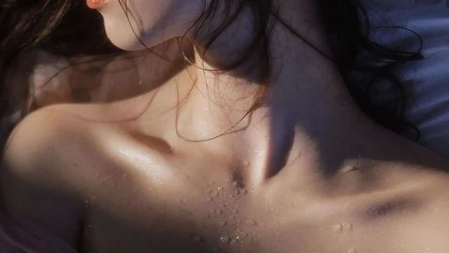 她的身上还挂着水滴,白皙透亮的肌肤在阳光下散发着珍珠般的光泽。