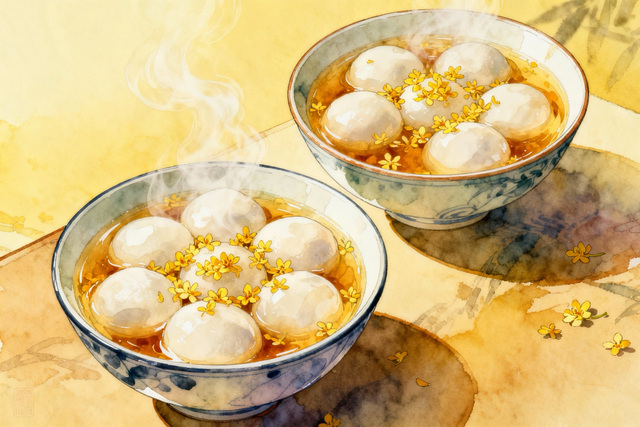 白玉般的圆子在琥珀色的汤汁中沉浮,上面撒着金黄的桂花,散发着诱人的香气。