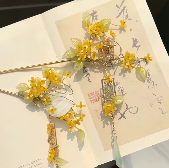 而后 桑婼好似看见了什么宝贝 把手上的发卡全放下 招呼着青鸾过来 桑婼指着被摆的架子上的 一个桂花型的簪子 下面有金色的流苏挂坠 最后桑婼扬起了自己的手腕 把手腕上的手链和桂花簪放在一起 桑婼的手链也是由桂花型的装饰物串成的