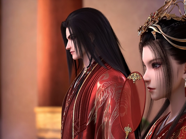 恰在此时,随着乐鼓声响起,婚礼的两位主角步入了宴席之中——顾剑门与晏琉璃,他们的面容皆无笑意,反而透着一股难以言喻的冷峻,仿佛不是一对即将结缡的新人,而像是彼此警惕的刺客。