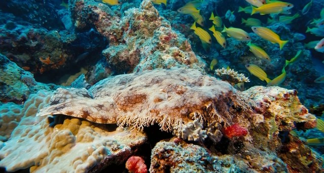一条斑纹须鲨改变自身颜色像地毯一样瘫在岩石上,等待食物自投罗网。