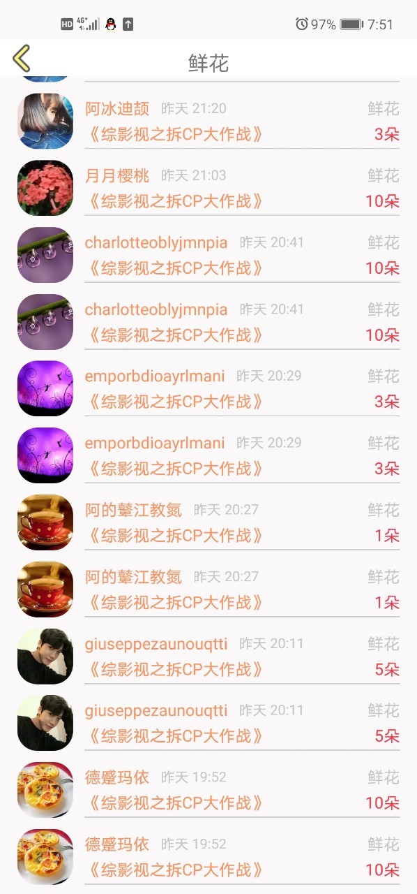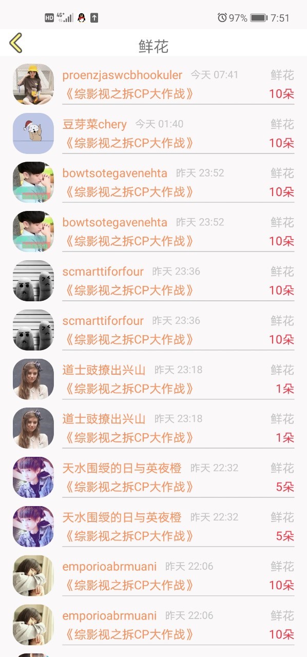 自成方:感谢这十四位小可爱送的花花,感谢~