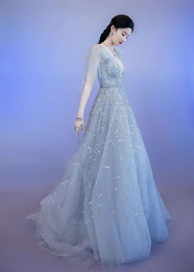 刘舒仪一袭深V薄雾蓝礼裙,身上穿戴同系列配饰,头发半束,披散于身后,只留额前些许点缀,黛眉轻描,眼线勾勒超眼尾些许,唇色橙红,整个人表情冷艳,气质高贵大方,俨然是红毯上最亮眼的丽色之一。