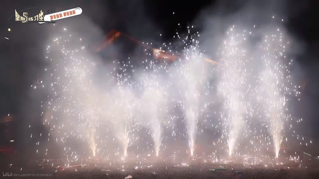 一排烟花被点燃,火星飞向半空。