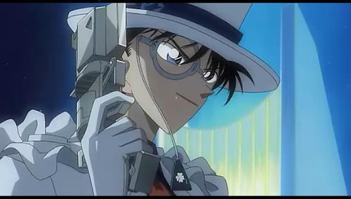 反观另一方,黑羽快斗见他已经发现了端倪,吹了吹自己的枪口,一阵白色烟雾而过,原本的“工藤新一”变成了头戴白色礼帽的魔术师。