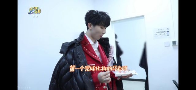 马嘉祺第一个化妆完成,一个人在吃着糖葫芦,一个人在打着游戏,等待你们化妆完成。