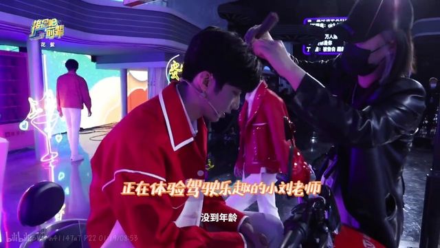 另一边又在抓娃娃的宋亚轩,以及坐在电动车上的刘耀文进行补妆。