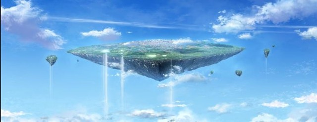 三个人坐着小飞艇,穿过了云层,很快就看见了一个空中悬浮的土地。