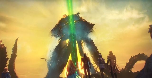 海域上出现了8条黑色的触手 在这8个触手之间也冒出了这个生物的头部 外表十分丑陋