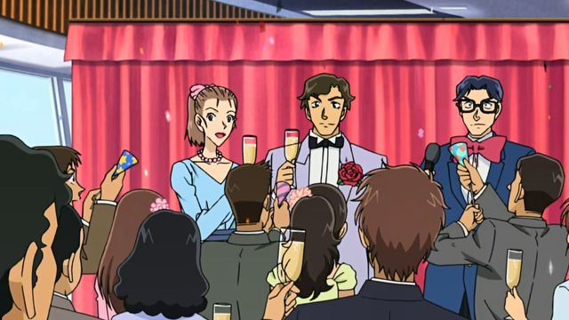 李语汐几人赶到现场后就看到主持人请新郎致辞,见状李语汐双手环胸不爽地啐了一声,随即便扭开头不去看他们,柯南则是在找北坂香织。