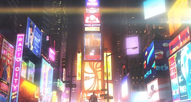 纽约的夜晚灯火通明,高楼大厦的霓虹灯牌在夜色中熠熠生辉,霓虹灯得光芒穿过了云层,与星星的光芒交织在一起,车水马龙,灯光璀璨。
