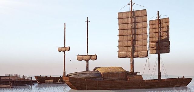 是夜,江面停靠两艘撑开风帆的桅杆船。其中之一,帆面上挂串着大大小小的红灯笼。