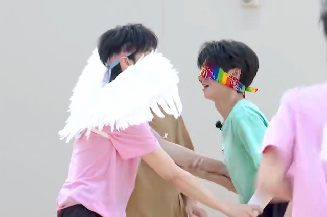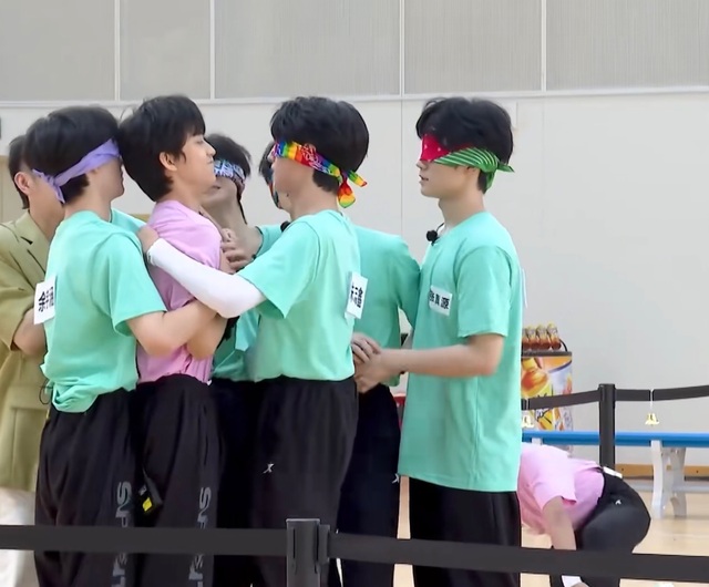 红队三名队员穿戴好道具,帮蓝队戴好眼罩