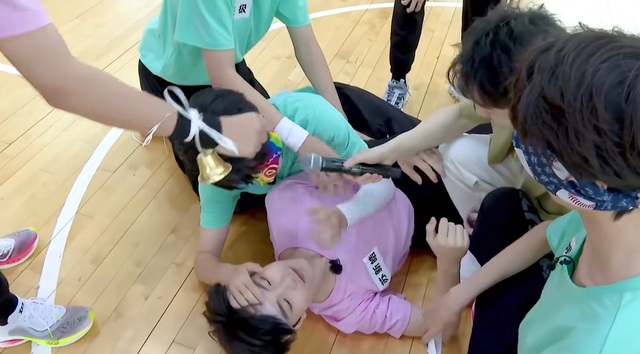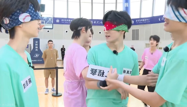 随便:主持人『停一下停一下啊,比赛进行到现在,场上红队只有一个人了,所以我们调整一下规则,蓝队你们三个不能用手挡你们的名牌,我们公平起见』