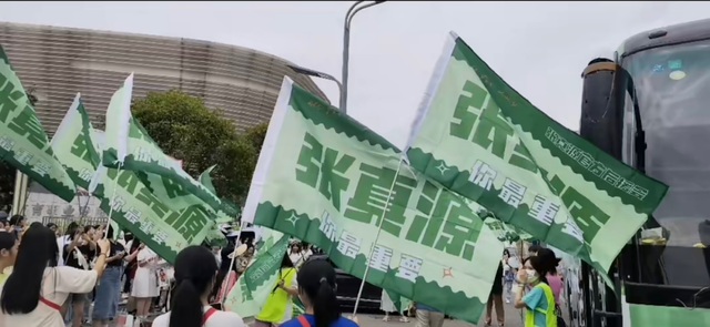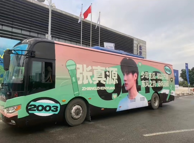 空地上随处可见应援的粉丝们,一辆辆大巴车车身上印满TF家族各位成员的图片,还带投屏的