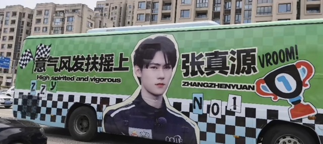 苏钰遥看到一辆张真源的应援车前,有个女生拿着麦喊