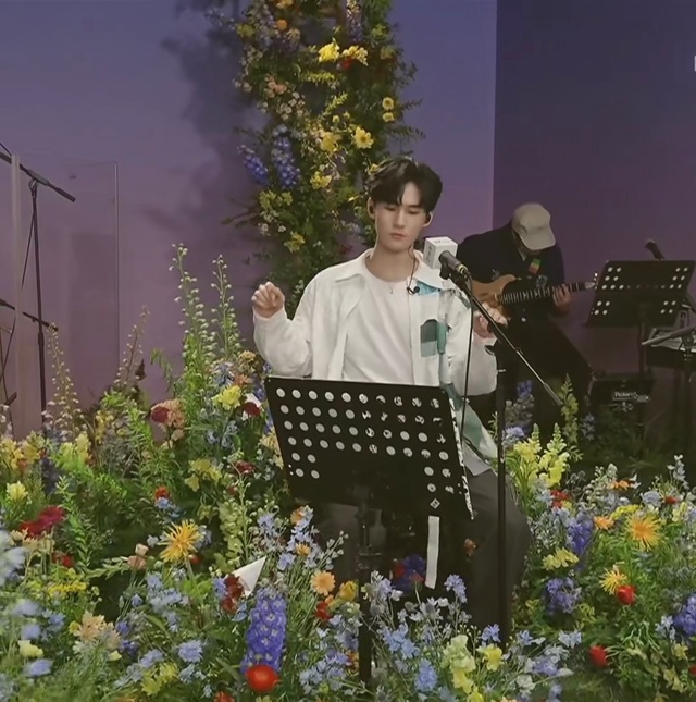 而在草坪靠后正中间布置着隐匿在各色花卉间的小型舞台,背后的纯色背景板上挂着巨幅幕布,此刻正播放着一身便服在哼歌的张真源