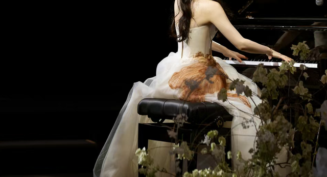 随着升降台缓缓升高,你身着华美的礼服,宛如月光下的精灵,优雅地端坐于一架庄重的黑色钢琴之前。