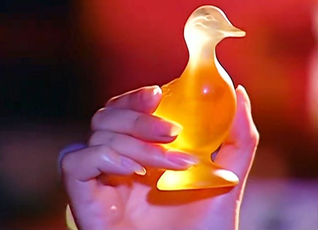 黄色的光芒与灯光相互交融,显得尤为夺目,美不胜收。如萍的眼神中满是惊喜与喜爱,她静静地凝视着这只鸭子,仿佛沉浸在一个美丽的梦境之中。