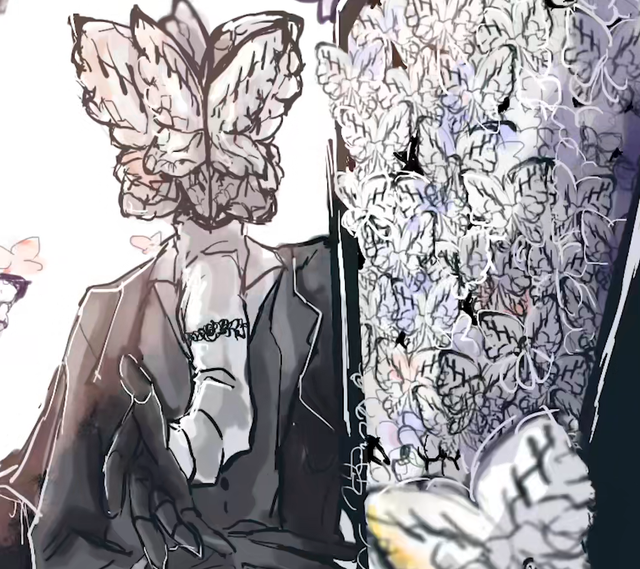 亡蝶葬仪:(用背后两只手将巨大的棺材矗立在地面)很早以前,人们常常幻想自己死后会变成拥有翅膀的美丽存在…