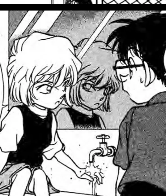 听到声响江户川柯南转头看向身旁,灰原哀不知何时已坐在洗手台边,正用水龙头流出的清水轻轻冲洗双手,镜中她冰蓝色的瞳孔里映出复杂难解的情绪,那一刻连她自己也辨不清那深藏心底的疑问——现在的她……究竟是真正的自己,还是占据了以前自己人身躯的陌生人?