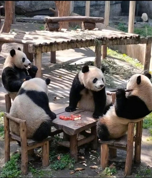 叶灵欣:哇,重庆的熊猫好可爱呀,四只熊猫坐在一起吃竹子,好有氛围感呀