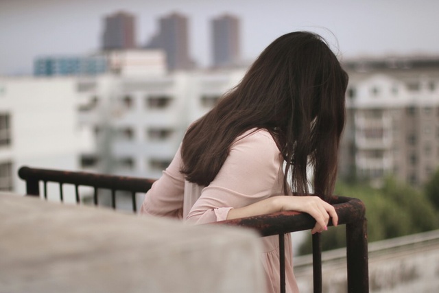 她紧紧抓着天台上的栏杆!