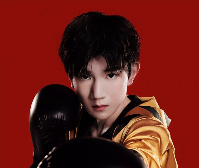 易烊千玺站在一旁,穿着红色卫衣,五官俊郎坚毅,眉目冷峻,看起来略显高冷不易接近。