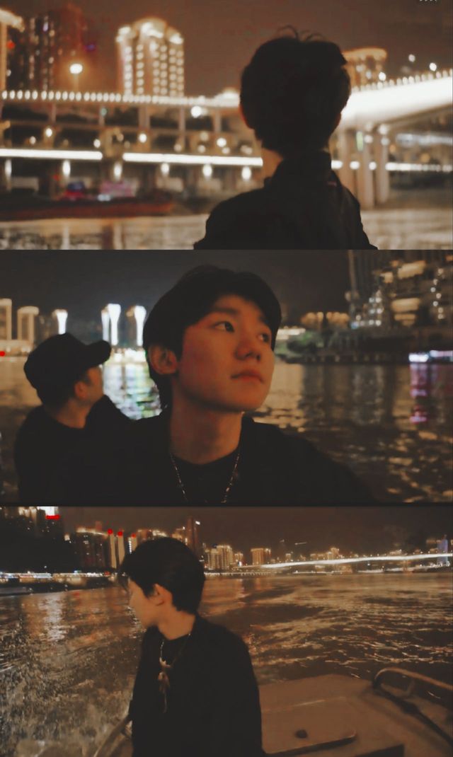 点点火光缀着夜幕隐隐约约映在江面,摇摇晃晃的游轮上江晚凝望着对岸,拔地而起的高楼大厦上闪烁着“重庆不打烊,青春不散场”。