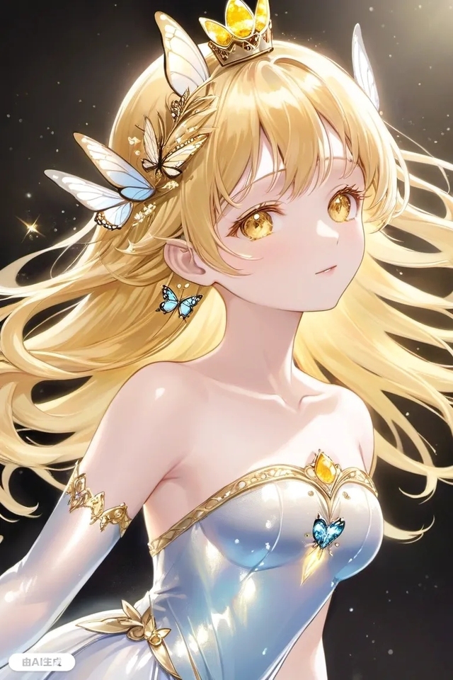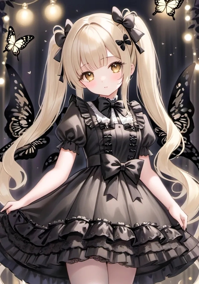 她如同夜空中最耀眼的星辰,身着一袭黑色连衣裙,宛如夜色中最深邃的梦。她那金色的长发如同流光溢彩的瀑布,轻柔地披散在肩上,却被巧妙地扎成了两条俏皮的双马尾,每一条都以精致的蝴蝶结作为点缀,更添几分灵动与可爱。她的眼睛,大而明亮,仿佛能洞察人心的秘密,闪烁着好奇与纯真的光芒。她站立之处,四周是绚烂的灯光与悬挂的灯笼,仿佛置身于一场梦幻般的盛宴。无数黑色彩蝶围绕着她翩翩起舞,增添了一抹神秘的气息。这幅画面,就像是从童话世界中走出的一幕,让人不禁沉醉其中,不愿醒来。