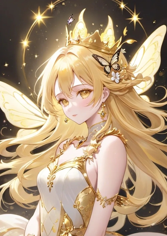 安琪儿女神站在一片黑暗之中,周围环绕着点点星光,仿佛是夜空中最耀眼的星辰。她拥有一头金色的卷发,宛如阳光般明媚,两侧的白色角状装饰增添了几分神圣的气息。她的耳朵上挂着红色蝴蝶结形状的耳饰,既精致又不失俏皮。身着一件黄色长袖低胸装与同色系的短裙,裙摆边缘点缀着一圈细腻的蕾丝花边,显得既优雅又高贵。她手中紧握着象征着权力与智慧的权杖,那权杖上镶嵌着璀璨的宝石,散发出柔和而神秘的光芒。安琪儿女神的站姿自信而坚定,整个形象给人一种既神秘又不可侵犯的威严感。