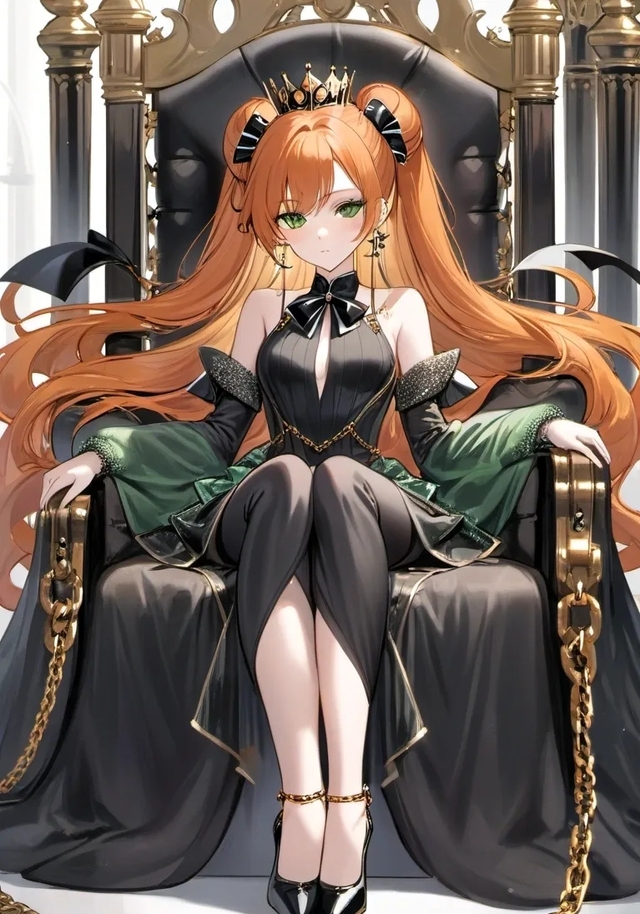 萨维利坐在华丽的宝座上,她的橙色长发如同流动的火焰,在月光下闪耀着柔和的光芒。她那双绿色的眼睛深邃而宁静,仿佛能洞察世间的一切秘密。身着黑色连衣裙,搭配精致的皇冠与装饰品,萨维利显得既神秘又高贵。周围环境的奢华与她的平静表情形成了鲜明对比,让人不禁猜想,此刻的她在思考着什么遥远的事情。