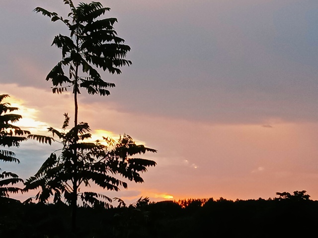日暮时分,世界仿佛被柔和的粉红和橙色轻纱轻轻覆盖,天空如一幅水彩画般渲染开来。一棵姿态优雅的树矗立在前景之中,它的身影如同一位静默的诗人,羽状的叶片在夕阳的映照下宛如一串串展开的诗篇,树冠宛如一把巨大的天然伞,庇护着这片静谧的土地。这棵树,孤独而坚定,似乎诉说着森林深处的秘密。