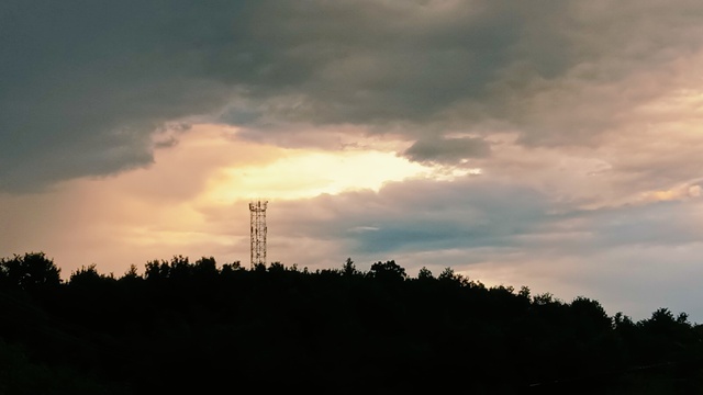 在时间的边缘,一幅宁静的画面悄然展开。一座通信塔,如同现代世界的守护者,坚定地屹立在一片繁茂的绿色之中,它的身影穿透了浓密的森林,直指苍穹。天空被深灰与暖橙交织的色彩染透,仿佛是大自然的调色板上,日出与日落的温柔交汇。背景中的树木,轮廓模糊,宛如剪纸般映衬着那座高耸的天线,它们的存在更显得这座技术奇迹的孤独与力量。前景的草木生机盎然,与后景的钢铁构造形成强烈的对比,诉说着人与自然的和谐共处,却又不失科技的冷硬之美。