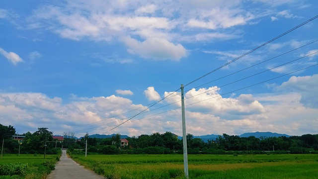 如诗如画的乡村画卷展开在眼前,天空中慵懒的白云悠然自得,宛如柔软的棉花糖在蔚蓝天空中编织着梦幻般的景致。一条蜿蜒的小径由近及远,引领视线穿越过碧绿的草地,直抵那座矗立在田野中央的红顶小屋,它的存在仿佛是大地的心跳,昭示着生活的温馨与宁静。房屋四周,青草如茵,生机盎然,昭示着这是一片富饶的农田之地,或许蕴藏着勤劳农民的希望与梦想。电线杆整齐地排列在小径两侧,像是乐谱上的音符,诉说着现代文明与自然和谐共存的旋律。远方,连绵的山丘层叠起伏,与天空的蓝色交相辉映,增添了几分深远与辽阔。整个画面色彩淡雅而和谐,绿色的田野、蓝色的天空与纯白的云朵共同绘制出一幅恬静的生活图景。