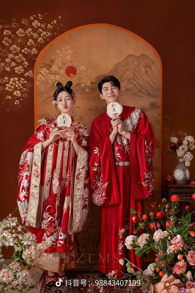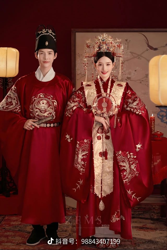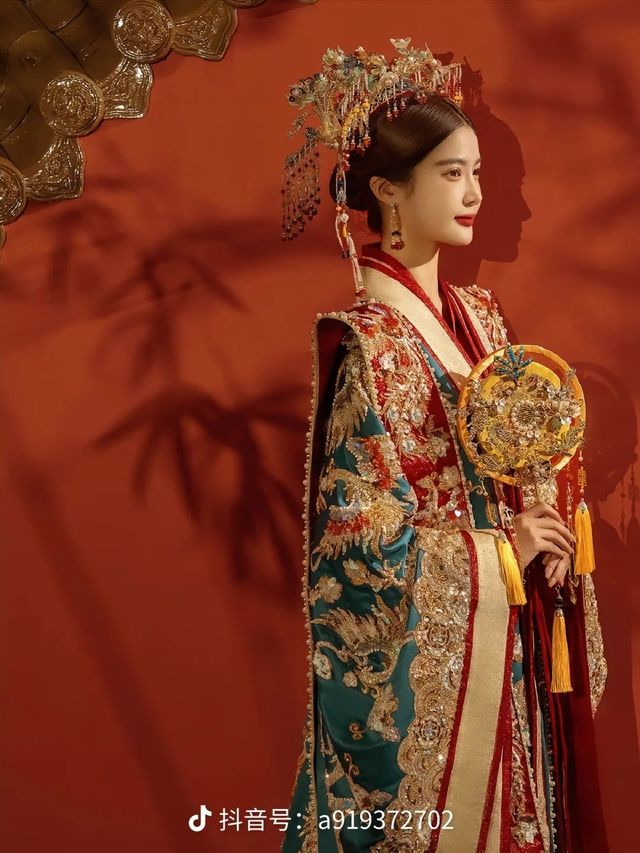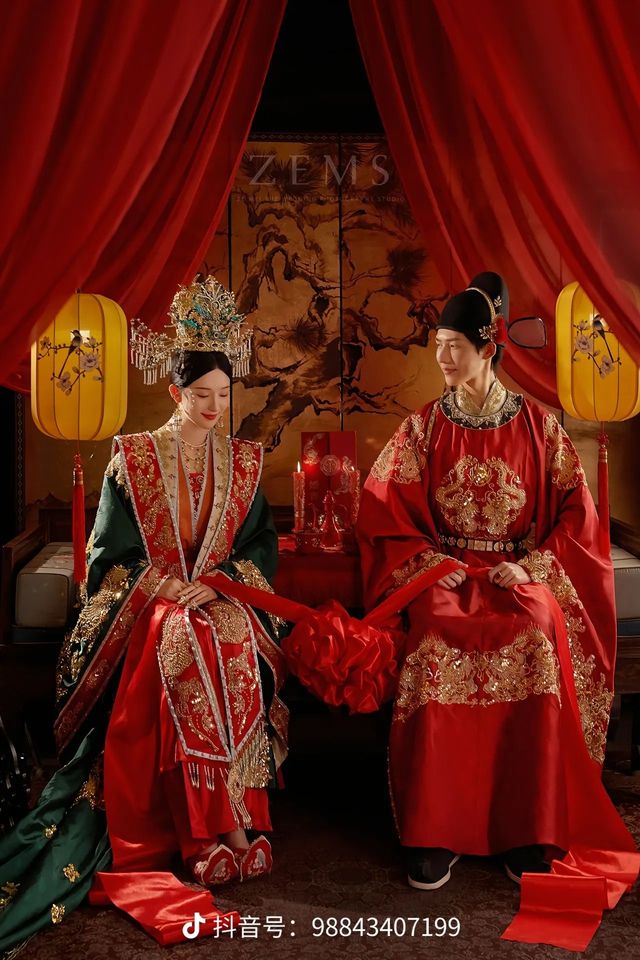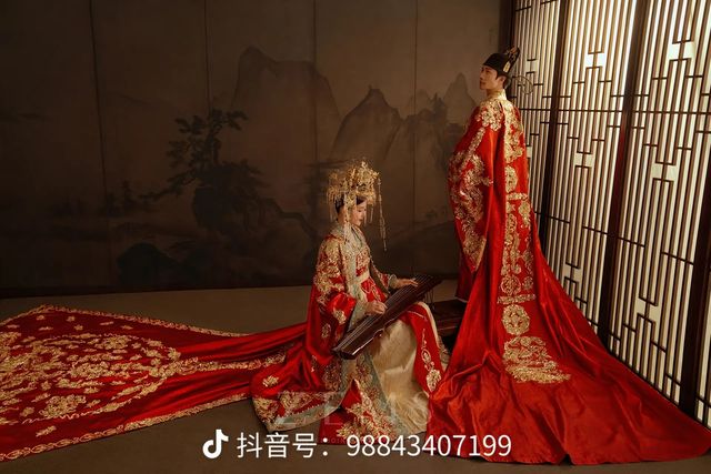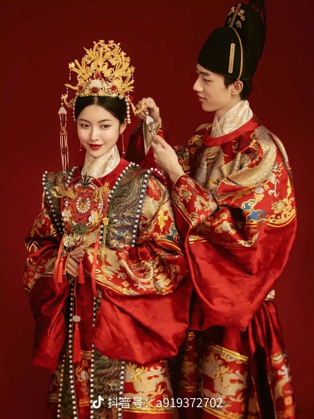 阿露佛奴:这是布料,想要做中式的,首先要了解它的特点。中式的特点是绣花,越花越好看,可以在新娘的服装上加上凤凰绣花,在新郎服装上,加上龙的绣花,代表着龙凤呈祥,此外,还要做头冠,顶配的是九凤冠,你也要做男士的头帽。