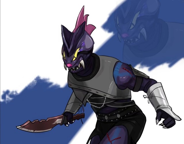 随后是一个紫色怪物,它身披银色的战斗盔甲,头部类似带有鸡冠猫脸,嘴里两颗尖牙流露着无尽的杀气