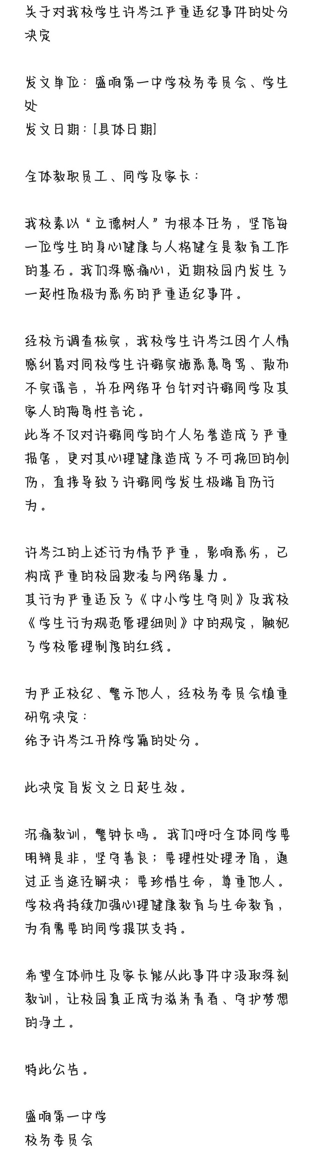 而关于许岑江这起校园暴力事件,经过学校领导以及教育局领导多次商讨决定,校务委员处也就是俞红妤老师那边已经整理了相关公告。