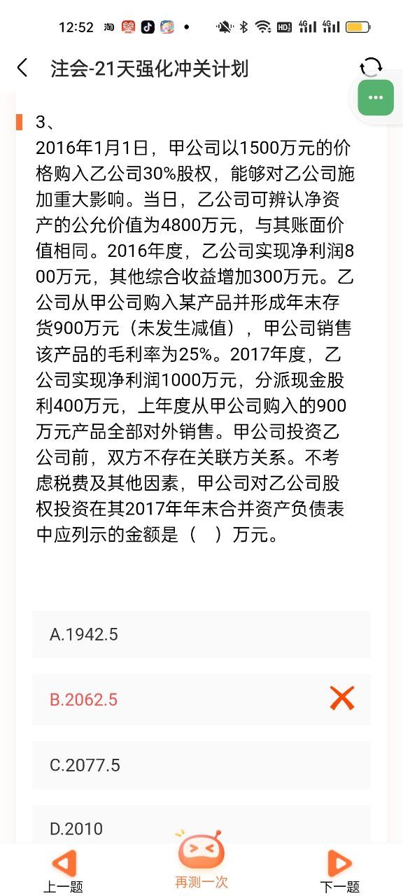 曼珠沙华:甲对乙投资的账面价值为2400