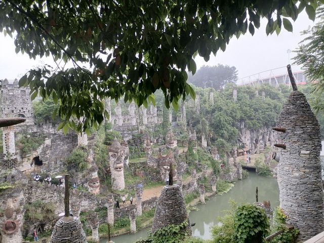 2:我们去夜郎谷玩了,我感觉自己仿佛进入了穷乡僻地,天空又下着雨,踩在湿透了的泥土上,我的鞋子和裤子真的好危险,老姐买了我俩的票~学生票半价。初入谷,我感觉自己仿佛进入了古代的某祭祀场所,面具好庄严肃穆,我们进入了内部,和其他游客一样拍照打卡,不过我们的拍照技术可能没有他们的好。