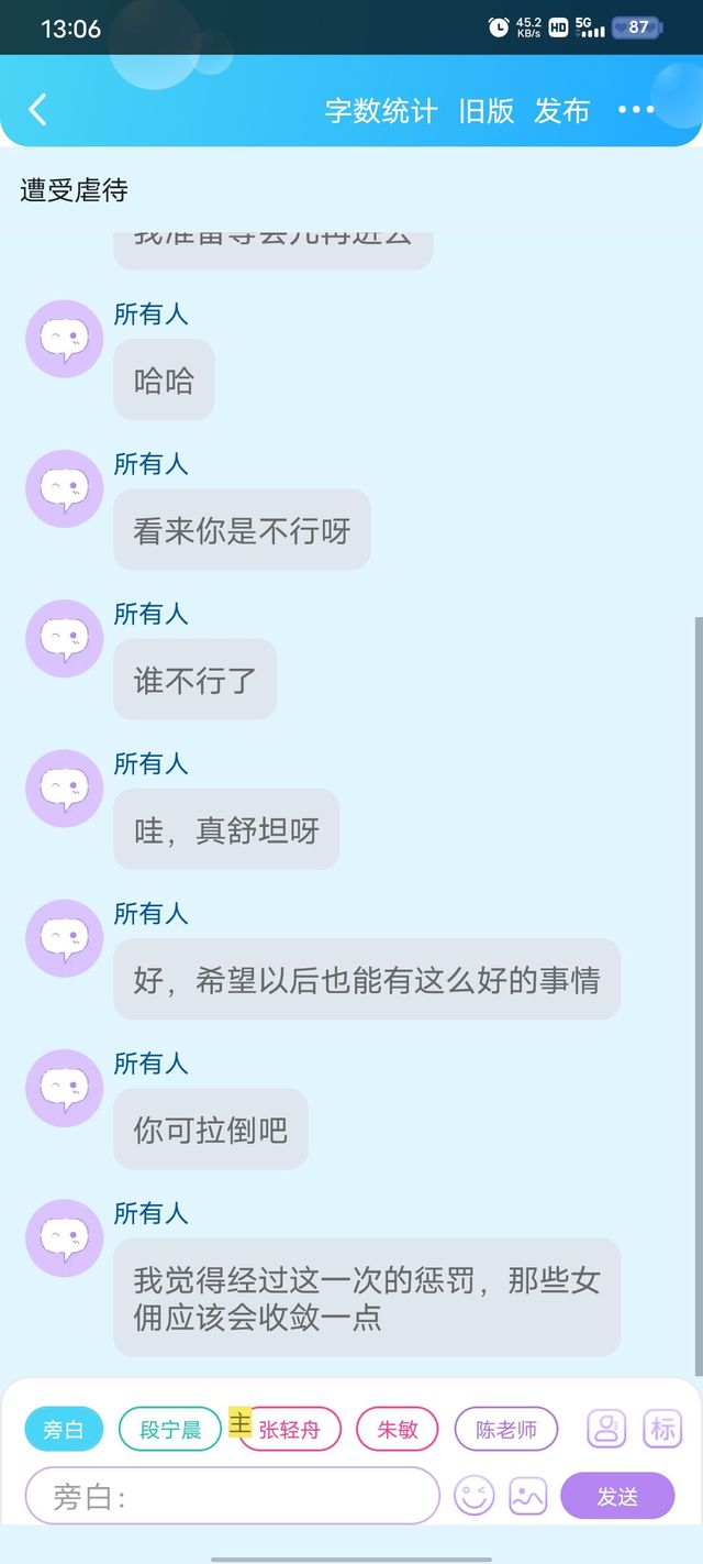 几个小时过去了,两个女佣终于得到了休息,但是身上的疼痛却没有因为他们的停止而消失。心中的恨又加深了。