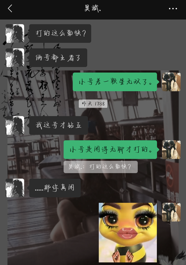 她都是在打小号,所以小号被人从星耀一带上了王者,然后她自己本来就也天天打小号,小号就莫名其妙的准备无双了。
