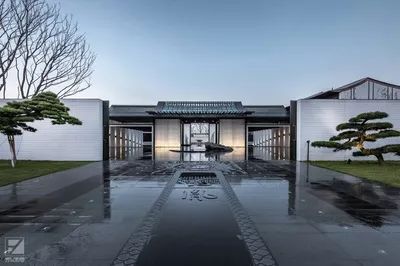 背后是黑瓦白墙的走廊直通正厅,脚下是露天的黑色大理石平台,黑白交映,美得如同一副动态山水画。