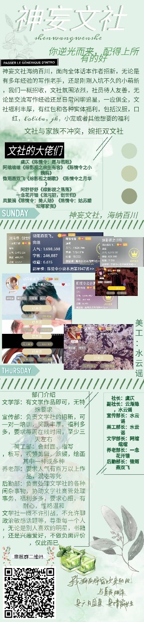 作者大大:最后,把我们文社的宣传图放上来,如果有小可爱要来,可以进审核群,注明推荐人是谁哦!