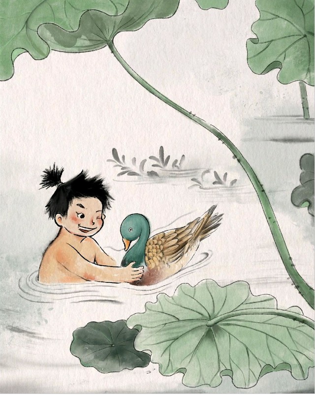 日子一天天地过去了。童娃娃逐渐长大,已经长成了一个少年。有一天,他到河里去游泳,正在游泳的时候,突然后背被一个东西撞击了一下,接着传来了一阵粗嗓门的大叫:“我是你的鸭子!我是你的鸭子!”