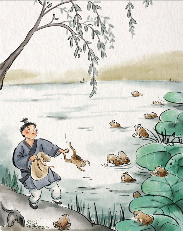 从他跑出主人家开始,那袋银子就在他腰里动来动去,他以为是由于跑得急了,银子跟着他的脚步在跳舞,可是此刻,他觉得那银子跳得很不正常。他停下来,解开那袋银子,想看看是怎么回事,却发现那不是银子,而是一袋癞蛤蟆。它们纷纷地从他手上跳到青草里和水池中了。